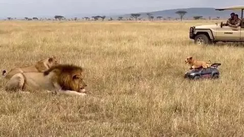 prank on lions in the savannah