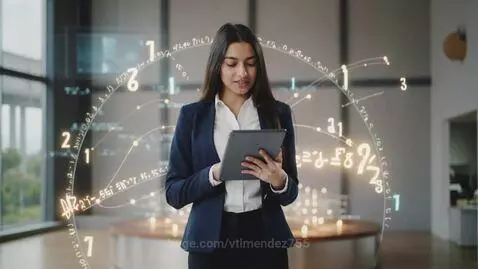 Kling 2.5 Turbo (pro) Prompt: A young female teacher standing on a modern school stage, wearing a formal outfit (white shirt, blue blazer, black trousers), holding a tablet. Background shows futuristic AI and mathematics theme — floating numbers, digital codes, glowing neural network lines. The atmosphere is inspirational and educational, symbolizing the connection between mathematics, informatics, and artificial intelligence. Soft, warm studio lighting.