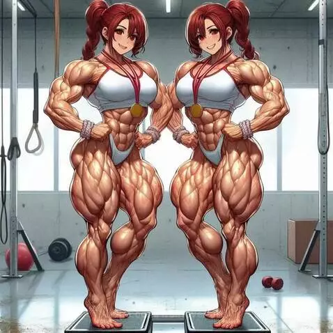 Twin muscular gymnasts lifting one leg up high, flexibility, confident expression, calm smile, legs shaking