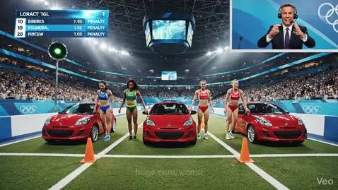AI Prompt: Olympic final in women’s parallel parking. Three athletic women wearing Olympic sprinter-style sportswear stand side by side in front of identical small cars on a marked track inside a large sports stadium. A tense commentator voice announces: “This is it — the Olympic final!” At the start signal, the women quickly open their car doors, jump in, start the engines, and begin carefully reversing into narrow parking spaces outlined with orange cones. The crowd watches in silence. Each driver clips or knocks over at least one cone. A digital Olympic-style leaderboard in the top left corner updates with penalties. The commentator exclaims dramatically: “All hit a cone — no gold medal today!” The camera ends on a wide shot showing all three cars slightly crooked, cones neatly toppled around them.