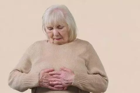An elderly Russian woman with wrinkles, wearing a beige sweater, looks down in horror as her bust expands, becoming rounder and larger