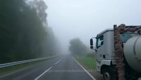 A white truck with a tank and a twisted hose attached is driving down a road surrounded by trees in cloudy, foggy weather
