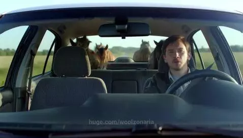 Dog driving a car while a cat in the front seat and two horse in the back seat