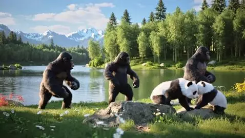 4 panda playing and a 6 gorilla dancing be the a lake