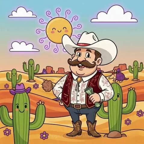 PixVerse v5 Prompt: Can you animate this scene? Can you make sure to keep the money in the picture, have the sherif throw it in the air. And add more money, have him pull money out of his pockets and throw it around. Make sure to animate the foliage and the sun and sky also