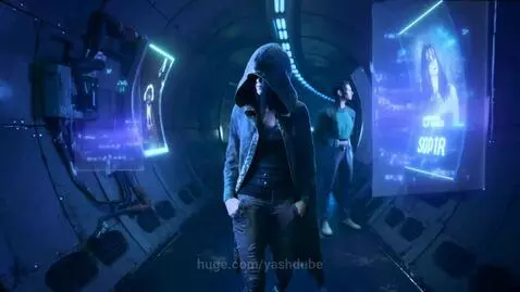 A cinematic ultra-detailed photorealistic short scene. Cyberpunk, 2099 year. Dimly lit metro tunnel, people walking between flickering holograms, vendors selling cheap data chips, hooded young woman passes slowly.