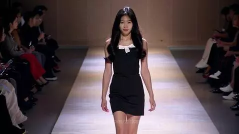 A beautiful Korean woman (she is young) walks down the runway in a short black dress with a white bow and winks. She has long black hair that reaches her shoulder blades.