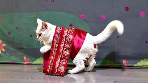 A white cat wears red sari of India dancing Kuch Kuch HOTA hai