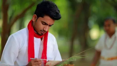 The same young Indian man in white kurta-pajama and red scarf, holding a palm-leaf manuscript, a faint image of Tulsidas with bandages writing Hanuman Bahuk, while Hanuman’s divine light heals him.